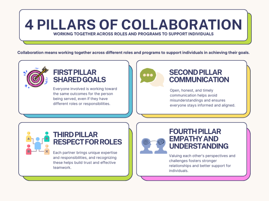 Collaboration is the act of working together across roles and programs to support individuals in achieving their goals.